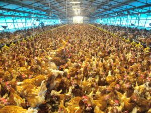 Hens inside the shed of a free range farm allowing up to 10,000 birds per hectare for the outdoor stocking density:
