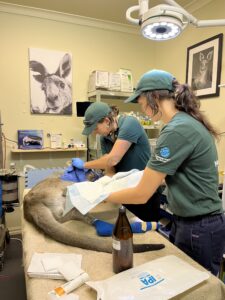 Sedated kangaroos are carefully loaded into the “Roo-bulance”—a large padded cart—and taken inside for weighing, pain relief and a second, more detailed veterinary examination. Some then move straight to the operating table, where hours of treatment can follow.