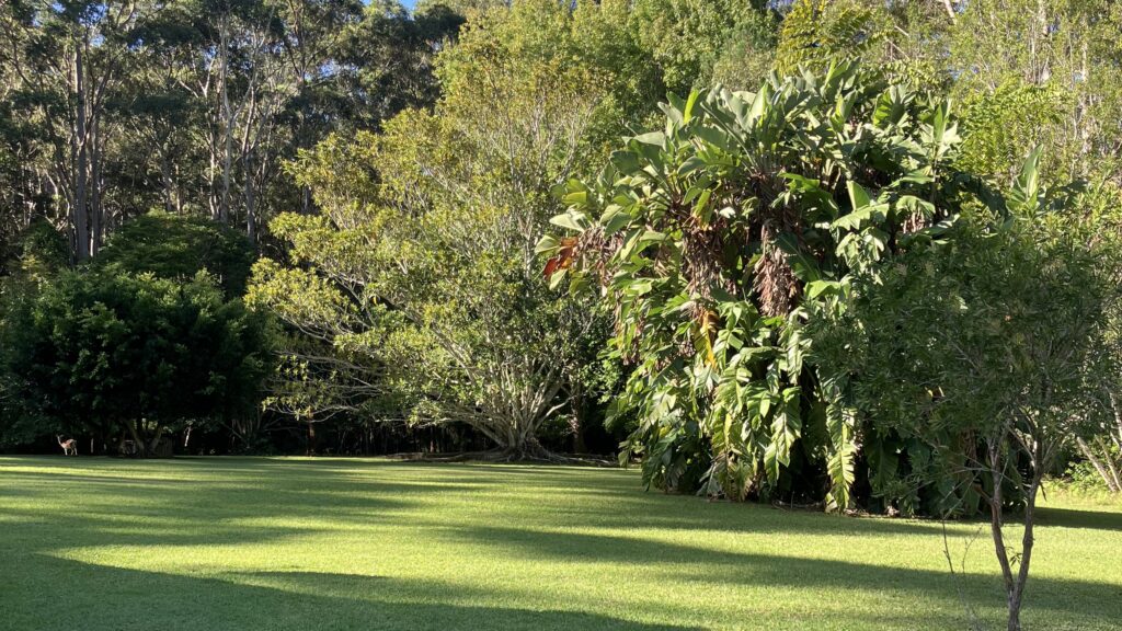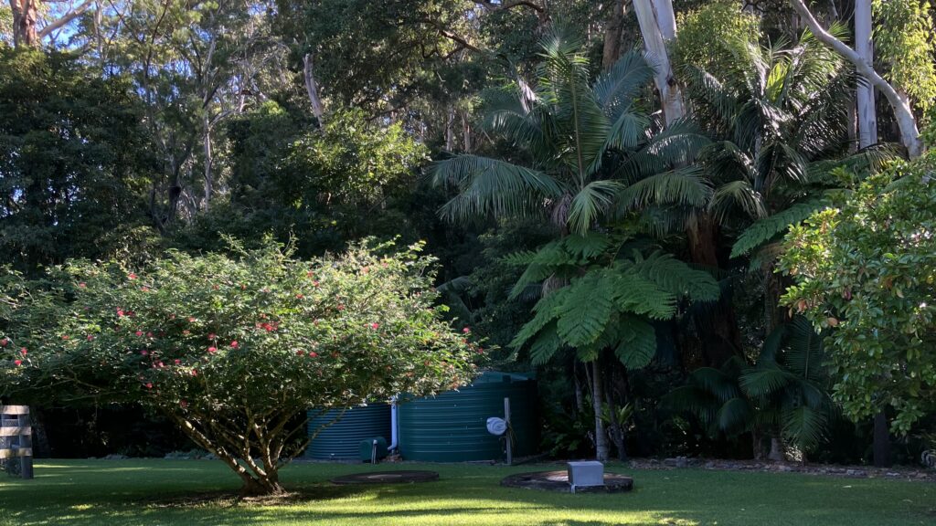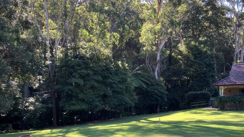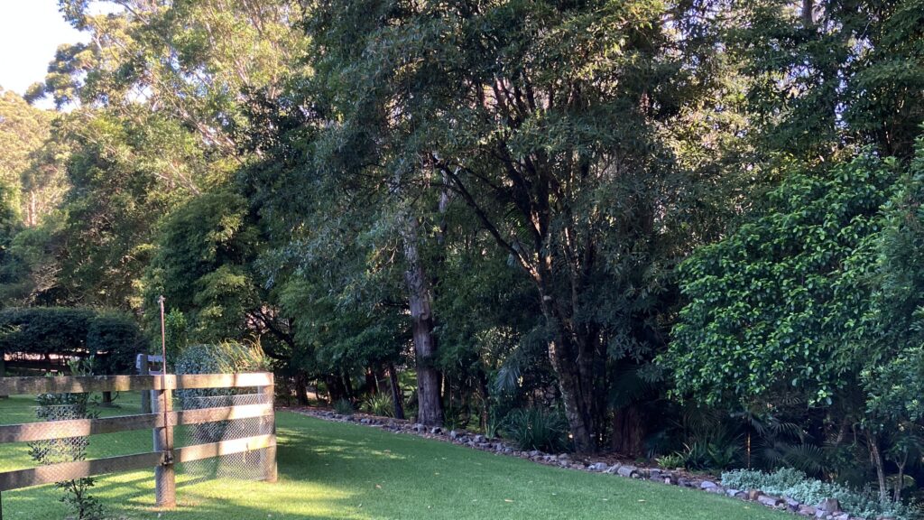 Noonaweena spans 1.01 hectares across Wet sclerophyll forests including the plant community types of Lower North Ranges Turpentine Moist Forest and Hunter Coast Ranges Turpentine Wet Forest. The property features flora species such as subtropical plants, tree ferns, palms and birds’ nests ferns (Asplenium australasicum), an abundance of eucalypt trees, a large macadamia tree, mango tree, jacaranda tree, bottlebrushes (Callistemon sp.), a huge Moreton Bay fig tree (Ficus macrophylla) and several ornamental fig trees (Ficus spp.). The property has about six different types of lilly pillies, liquid amber trees and lots of Pittosporum trees.